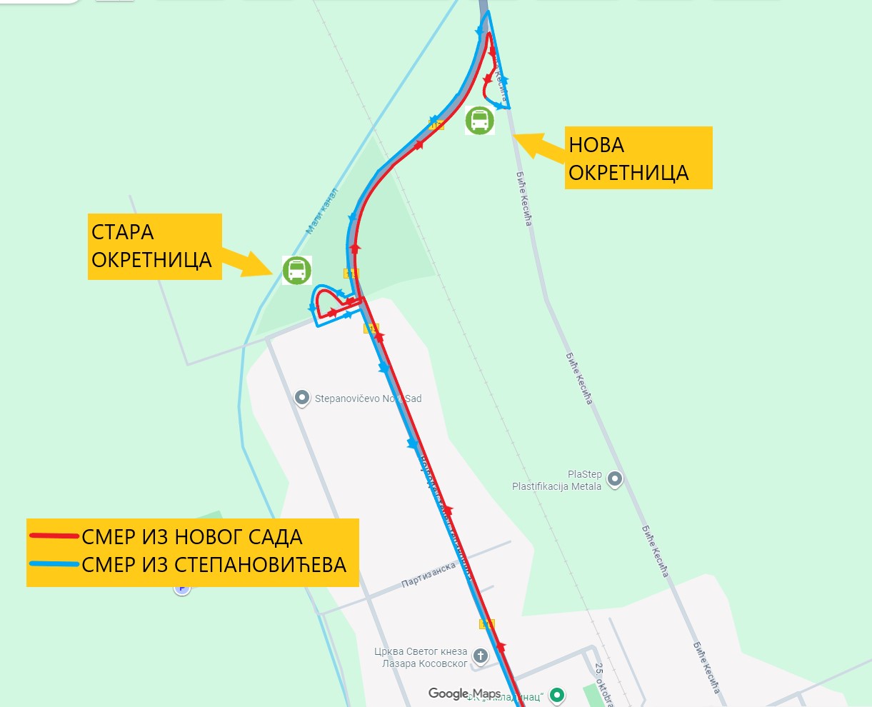 Након доласка на стару окретницу у Степановићеву аутобуси саобраћају преко надвожњака (пут за Змајево), скрећу десно у Улицу Биће Кесића до нове окретнице, где се чека време до наредног поласка за Нови Сад.