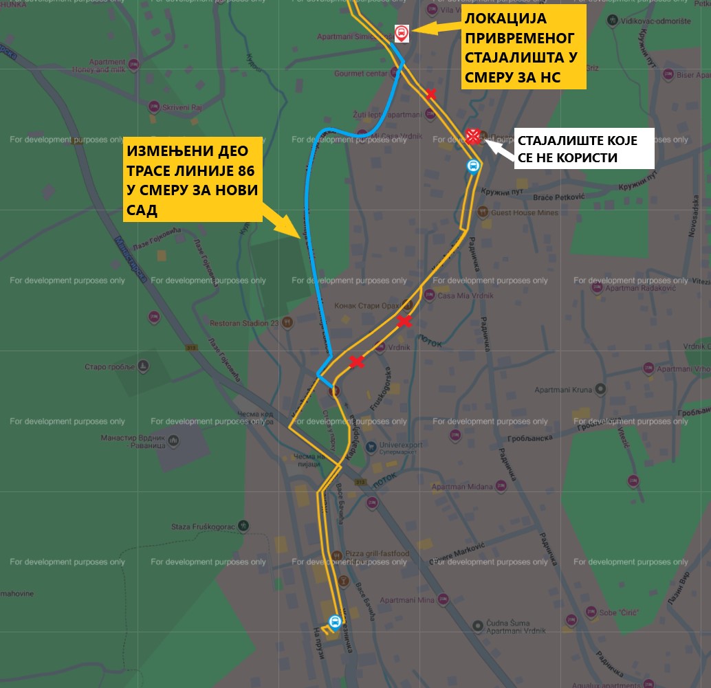 U skladu sa obaveštenjem o zatvaranju Fruškogorske i Radničke ulice u Vrdniku, zbog izvođenja radova na rekonstrukciji ulice od 02. decembra 2025. godine do 16. januara 2026. godine privremeno će biti izmenjen deo trase linije broj 86.